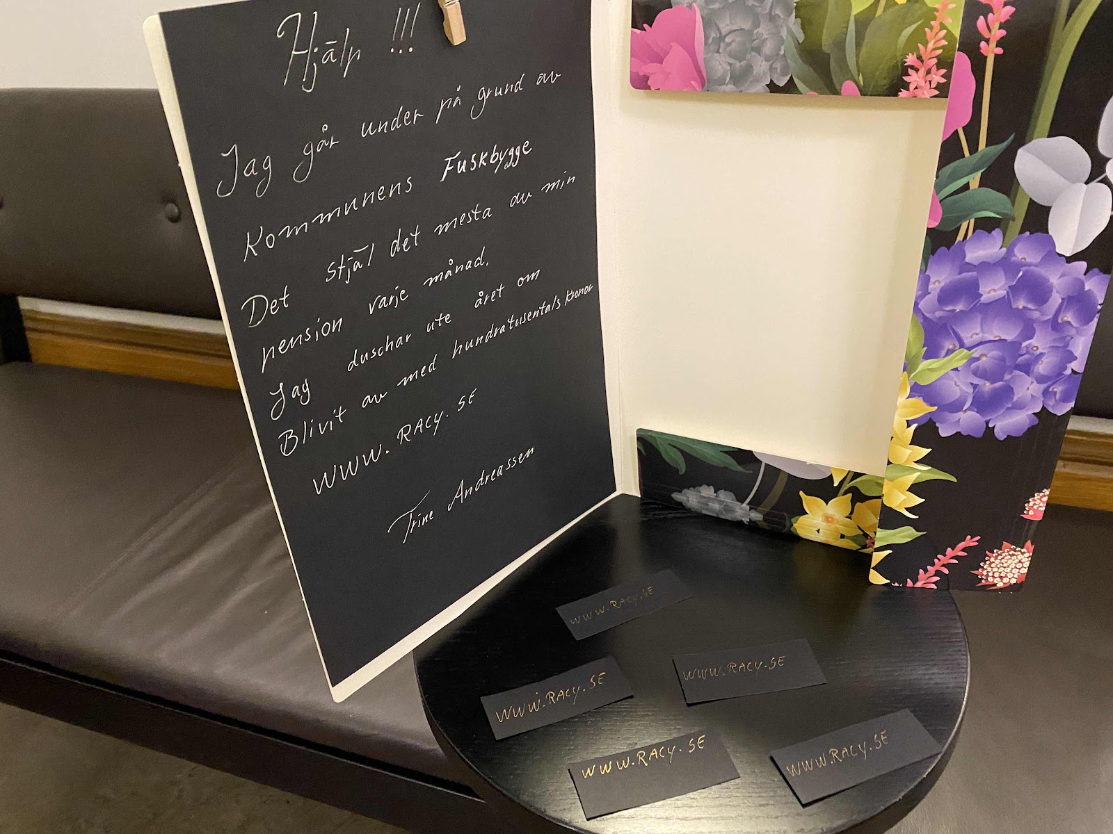 I dag har jag varit i kommunhuset. Jag ockuperade ett litet bord och delade ut små svarta lappar av fint konstnärspapper och skrift i skimrande guldbläck, skrivet med riktig dipp- penna. www.racy.se stod det på lapparna.